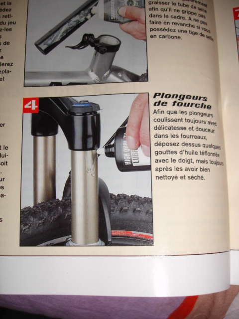 Pour ce qui est de la lubrification interne des fourches qui fonctionnent sans huile, j'imagine que cela doit dépendre de chaque fabricant et modèle de fourche (utilisations de matériaux autolubrifiant comme le teflon ou le bronze qu'il ne faut surtout pas lubrifier au risque d'accélérer leur usure, de la graisse sur certains modèles d'entrée de gamme comme rst). Dans le dernier cas la fourche sera lubrifiée aprés démontage/nettoyage, si elle a fini par s'assécher, c'est que l'étanchéité intérieur/exterieur n'est pas au rendez vous, elle est donc tartinée, y compris à l'intérieur, d'une jolie pate à polir noire (poussière+graisse), se contenter de recharger en lubrifiant ne fera que fluidifier cette pate abrasive (ha si, ça va aussi améliorer sa capacité à receuillir un peu plus de poussière