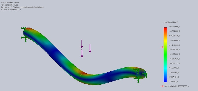Le déplacement du rayon dans le tensiomètre dépend du rayon non? On aurait un rayon en chewing gum la force à appliquer serait minime et donc la mesure serait faussée non? Et dans l'absolu ce déplacement mesuré dépend aussi du diamètre du rayon non? On aurait alors des tensiomètre pour chaque diamètre de rayon différent et pour chaque matériaux différent et ce n'est pas le cas...D'où ma question comment relié la lecture du tensiomètre avec la norme des vecteurs en rouge..? Soit c'est tout bêtement les 80N que l'on lit (dans ce cas c'est normal qu'on est un tensiomètre unique) soit il faut faire des calculs de rdm et relié le déplacement à l'effort de traction au bout du rayon...(et là les tensiomètres serait différent ou ferait des grosse approximations)